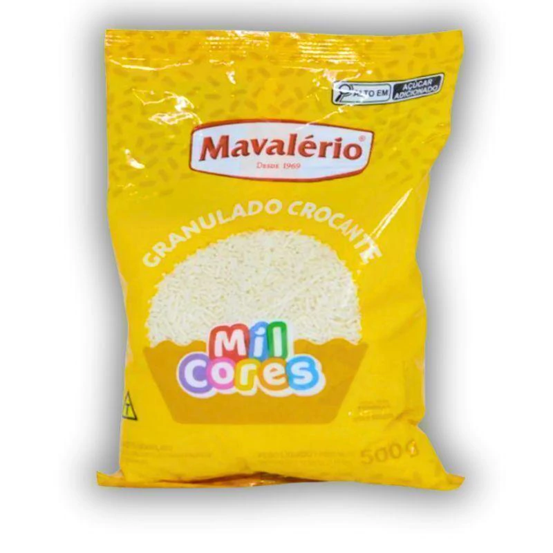 O Granulado Mavalério Branco é um confeito de açúcar indispensável na confeitaria, pertencente à linha "Mil Cores". Com uma cor branca pura e acabamento brilhante, ele é a escolha perfeita para decorações que buscam elegância, suavidade ou um contraste limpo com massas escuras, garantindo um visual profissional e delicado aos doces.